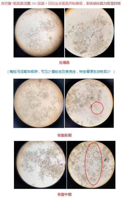 (3)投加庫巴魯®氨氮激活菌201,恢復(fù)系統(tǒng)硝化能力,改善生化處理效率。