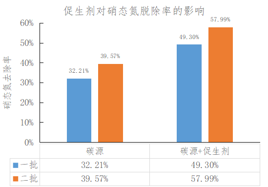 促生劑對反硝化脫氮的促進作用:以某廠化工污水生化處理過程中的脫氮效果為例,添加水體十萬分之一的促生劑能夠提升17.09%-18.42%的硝態(tài)氮脫除率。